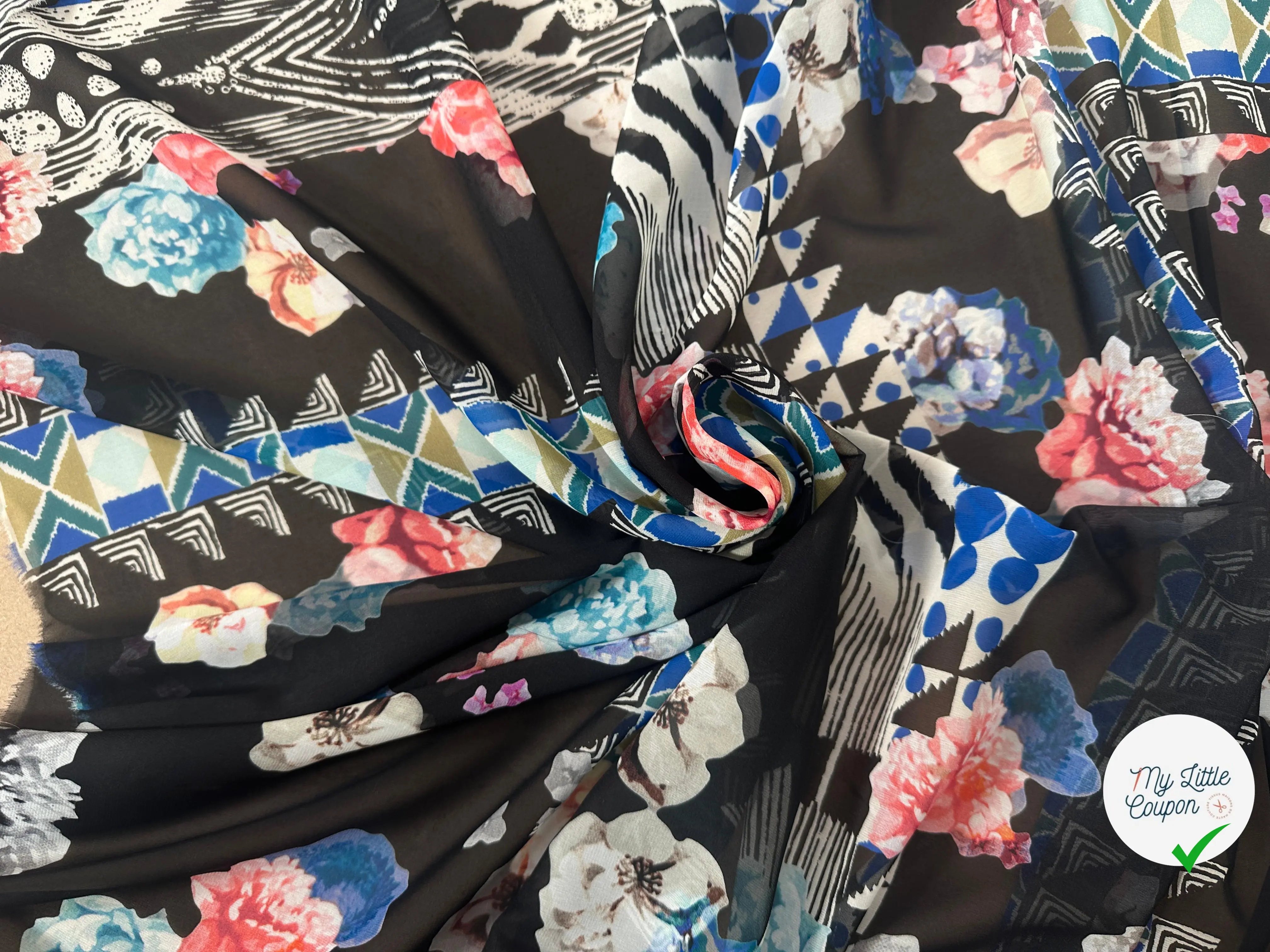 MOUSSELINE DE SOIE FIORI E GEOMETRIA SFONDO NERO